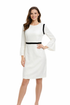 Crafted from a high-quality, lightly textured stretch-crepe fabric, this dress offers both structure and comfort. The soft ivory body creates a clean, polished canvas, while bold black straps trace over the shoulders and wrap around the waist, creating a powerful color-block effect that masterfully defines and flatters your silhouette. The long sleeves are finished with graceful bell cuffs, adding a touch of on-trend, feminine flair to the minimalist design.