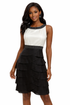 • Elegant colorblock design with a cream bodice and black skirt.