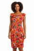 The dress features a bold, painterly floral print with oversized poppies and peonies in a dazzling palette of fiery orange, ruby red, and soft pink, all set against a crisp white background with sage green leaves. The flattering off-the-shoulder neckline is accented with a delicate ruffle, adding a touch of playful elegance. Crafted from a comfortable cotton-spandex blend, the sheath silhouette skims your curves beautifully, while a touch of stretch ensures you can move with ease.