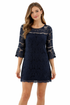 Crafted from an intricate floral lace, this dress blends timeless elegance with a touch of modern romance. The deep navy blue hue is perfect for any season, while the delicate lace overlay adds texture and dimension. Flared 3/4-length bell sleeves create a dramatic, flowing silhouette that's both flattering and fun. A chic shift cut skims the body for a comfortable fit, ending in a beautifully scalloped hem.