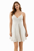 Front view of Illa Illa white textured lace mini skater dress on mannequin, featuring v-neckline and flared A-line silhouette, size medium.
